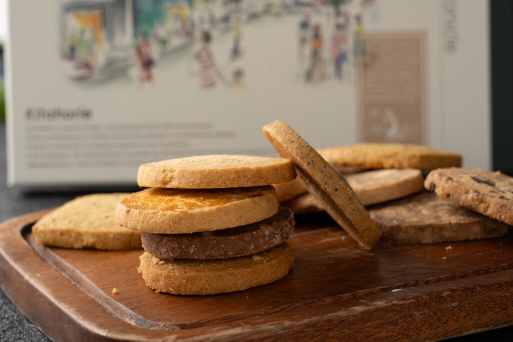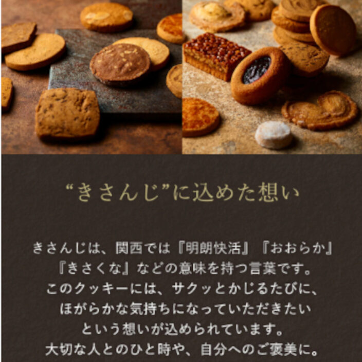 「きさんじ」とは、大阪弁で「さっぱりした」「おおらかな」という意味。サクサクっと軽くて美味しい、気さくなクッキーです。詰め合わせは大阪らしいパッケージをご用意しました。
